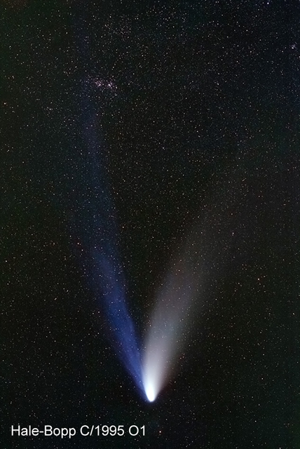 Bardzo interesujący jest wygląd komety z dwoma warkoczami. Nie ma w tym nic niezwykłego, gdyż każda kometa generuje dwa ogony: jonowy(gazowy), zwykle niebieskawy lub zielonkawy będący strumieniem jonów powstałych na wskutek działania promieniowania Słońca. Ogon jonowy jest zawsze zwrócony od Słońca, gdyż lekkie jony gazu są "zdmuchiwane" przez wiatr słoneczny. Drugi ogon to ogon pyłowy złożony z pyłu emitowanego z jądra komety. Ponieważ ziarna pyłu słabo poddają się działaniu wiatru słonecznego jest on zwykle przeciwnie zwrócony do ruchu komety i zorientowany stycznie do jej orbity, będąc jednocześnie nieco zakrzywiony. Zwykle ma barwę żółtą.